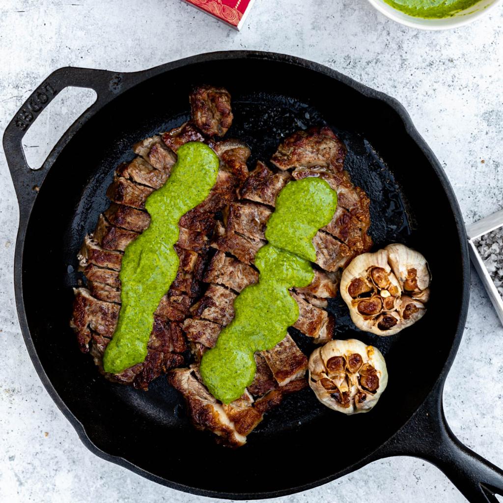 - Grill or cook (stove top) to desired doneness, then rest for a few minutes before slicing. Serve drizzled with chimichurri sauce.